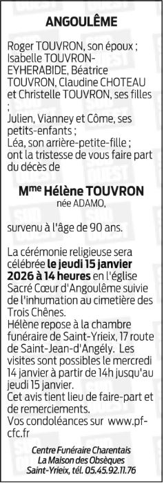 Cet espace « condoléances » est dédié à la mémoire de Madame HÉLÈNE TOUVRON née ADAMO.