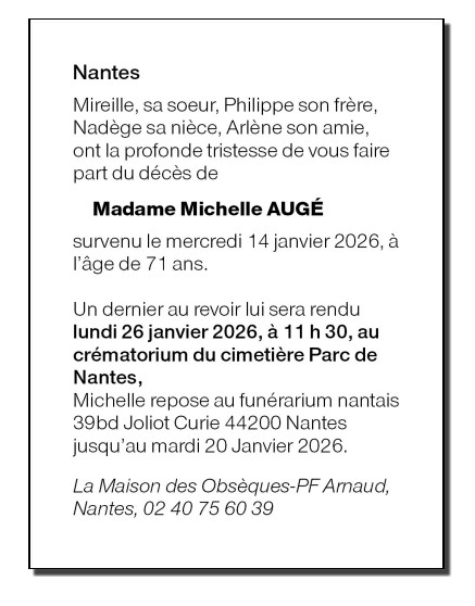 Cet espace « condoléances » est dédié à la mémoire de Madame Michelle AUGÉ.