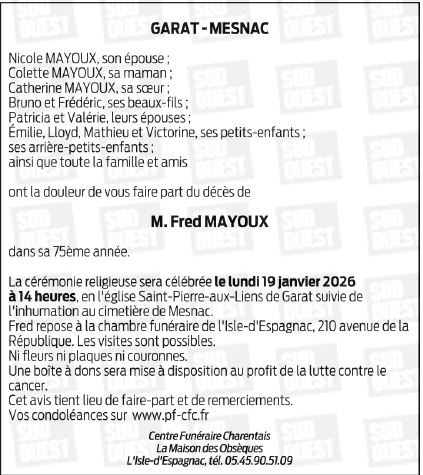 Cet espace « condoléances » est dédié à la mémoire de Monsieur FRED MAYOUX.