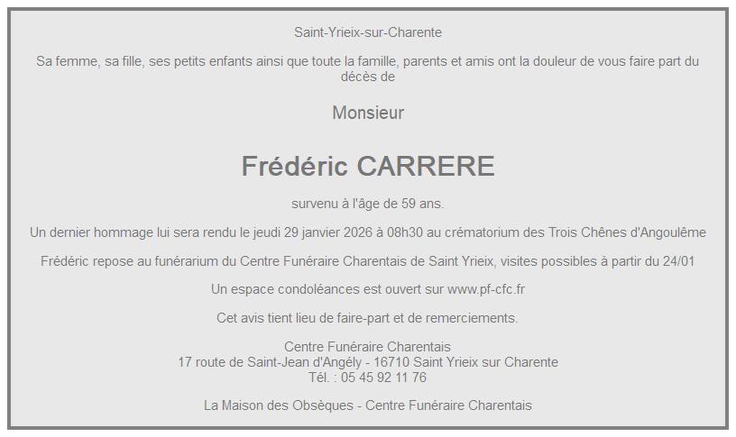 Cet espace « condoléances » est dédié à la mémoire de Monsieur Frédéric CARRERE.
