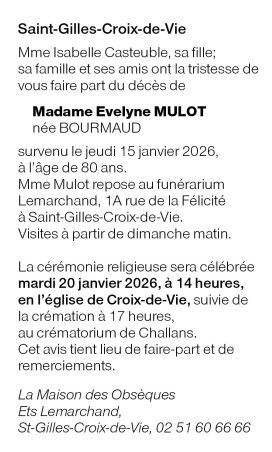 Cet espace « condoléances » est dédié à la mémoire de Madame Evelyne MULOT née BOURMAUD.