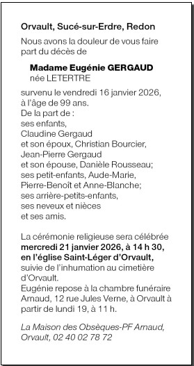 Cet espace « condoléances » est dédié à la mémoire de Madame Eugénie Gergaud née LETERTRE.