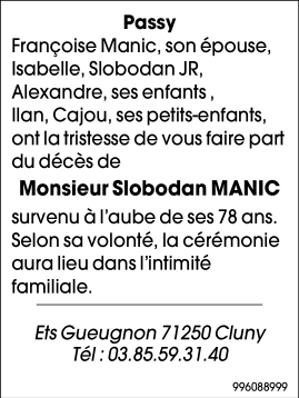 Cet espace « condoléances » est dédié à la mémoire de Monsieur Slobodan MANIC.