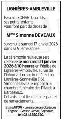 Cet espace « condoléances » est dédié à la mémoire de Madame Simonne DEVEAUX.