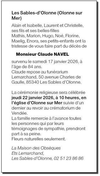 Décédé à Les Sables d'Olonne (85340) le samedi 17 janvier 2026