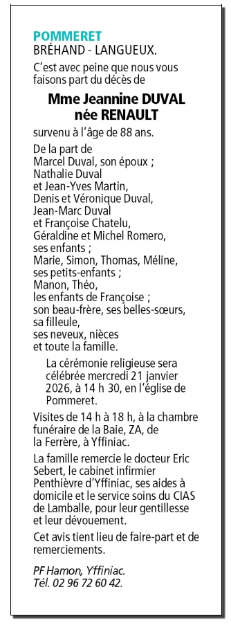 Cet espace « condoléances » est dédié à la mémoire de Madame Jeannine DUVAL née RENAULT.