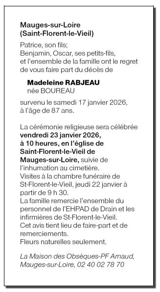 Cet espace « condoléances » est dédié à la mémoire de Madame Madeleine RABJEAU née BOUREAU.