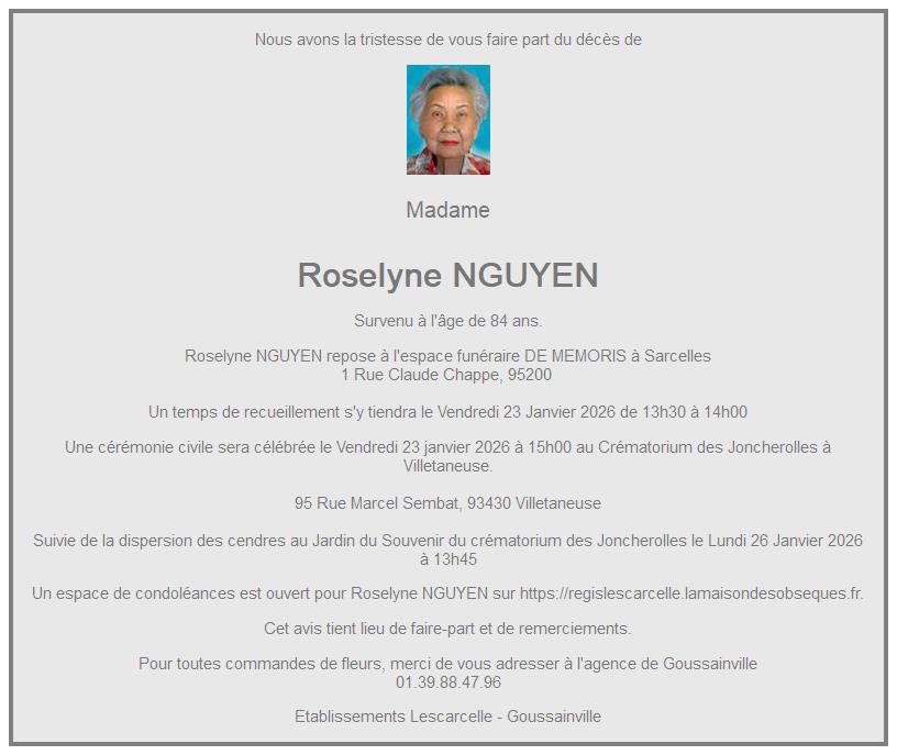 Cet espace « condoléances » est dédié à la mémoire de Madame Roselyne HUYNH née NGUYEN.