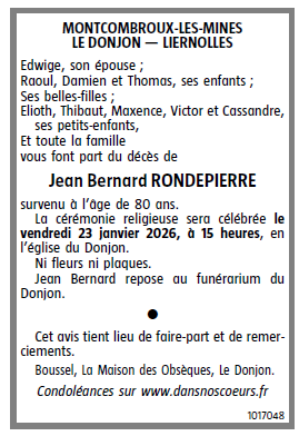 Cet espace « condoléances » est dédié à la mémoire de Monsieur Jean Bernard RONDEPIERRE.