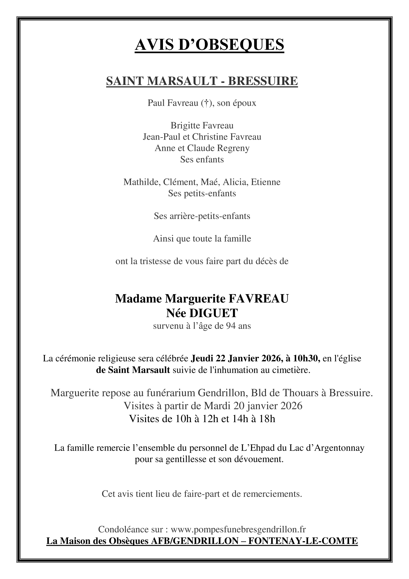 Cet espace « condoléances » est dédié à la mémoire de Madame Marguerite FAVREAU née DIGUET.
