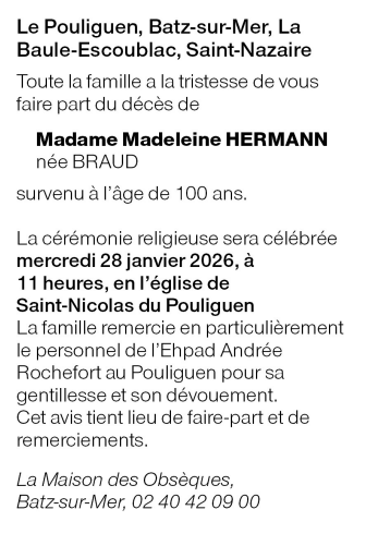 Cet espace « condoléances » est dédié à la mémoire de Madame Madeleine HERMANN née BRAUD.