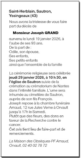 Cet espace « condoléances » est dédié à la mémoire de Monsieur Joseph GRAND.