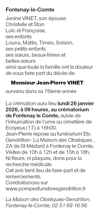 Cet espace « condoléances » est dédié à la mémoire de Monsieur Jean-Pierre VINET.