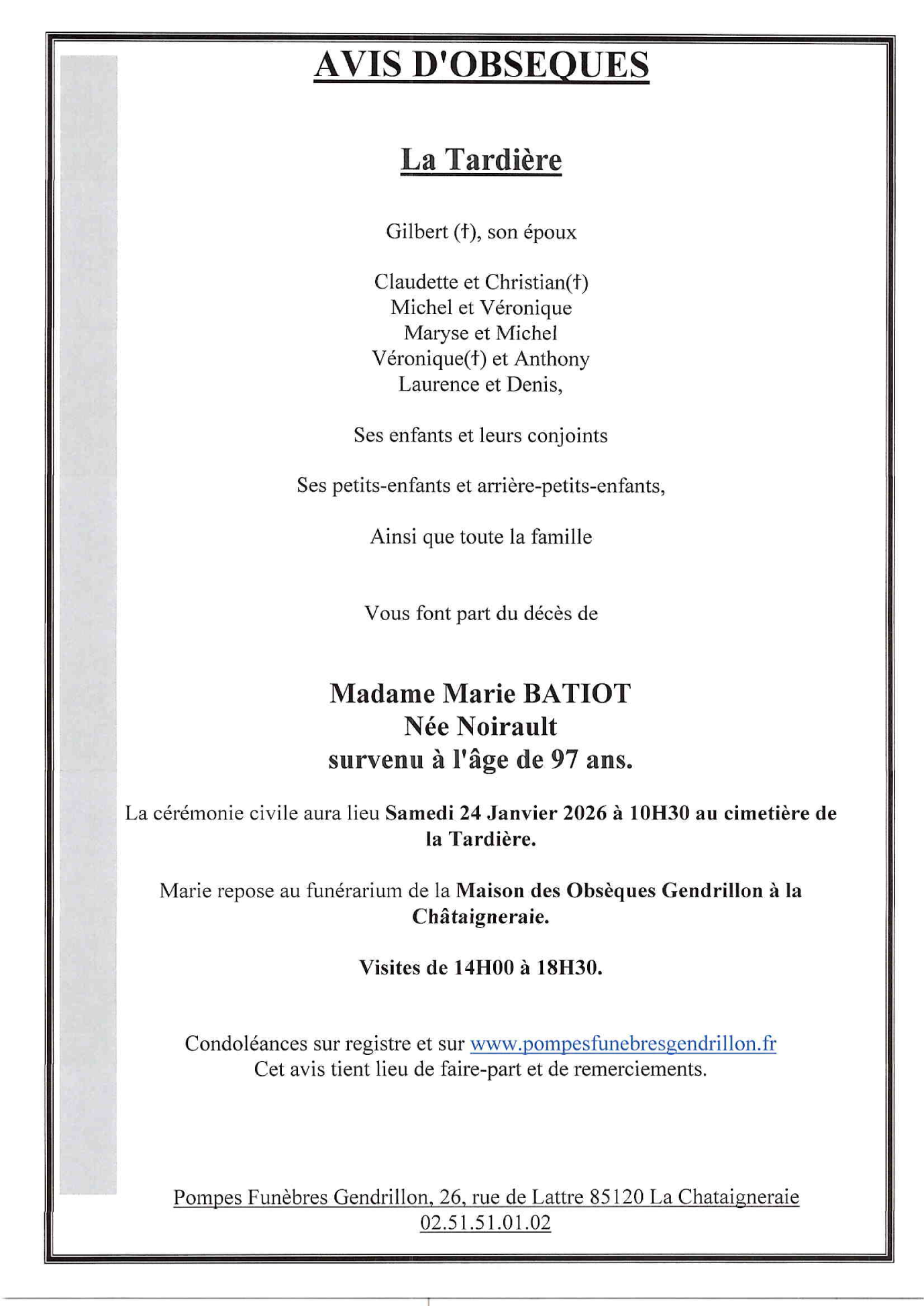 Cet espace « condoléances » est dédié à la mémoire de Madame Marie BATIOT née NOIRAULT.