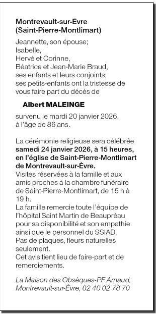 Cet espace « condoléances » est dédié à la mémoire de Monsieur Albert MALEINGE.