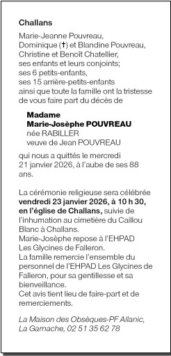 Cet espace « condoléances » est dédié à la mémoire de Madame Marie-Josèphe POUVREAU née RABILLER.