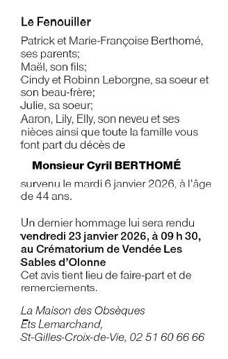 Cet espace « condoléances » est dédié à la mémoire de Monsieur Cyril BERTHOMÉ.