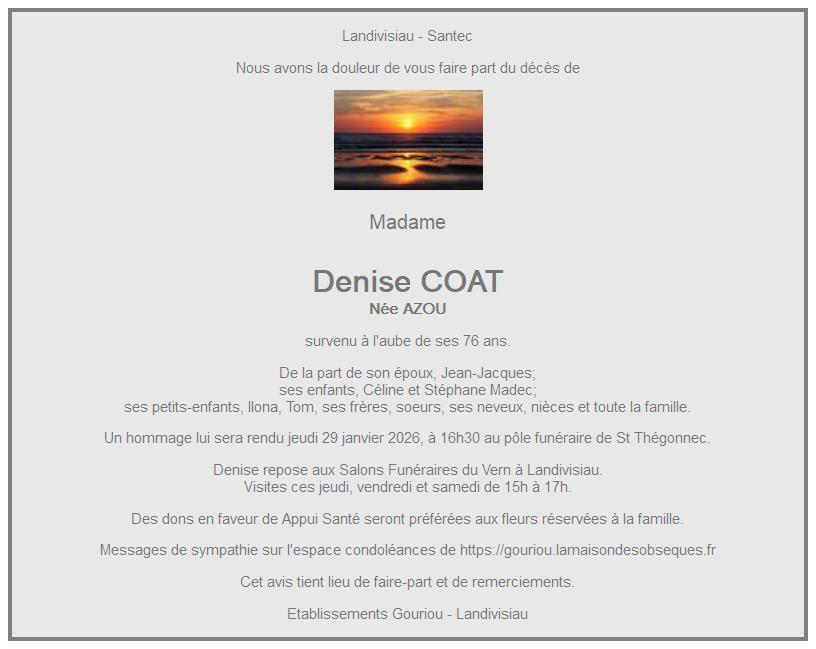 Cet espace « condoléances » est dédié à la mémoire de Madame Denise COAT née AZOU.