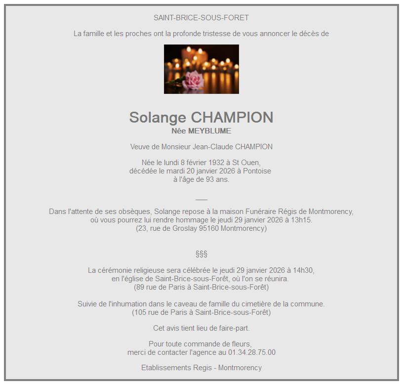 Cet espace « condoléances » est dédié à la mémoire de Madame Solange CHAMPION née MEYBLUME.