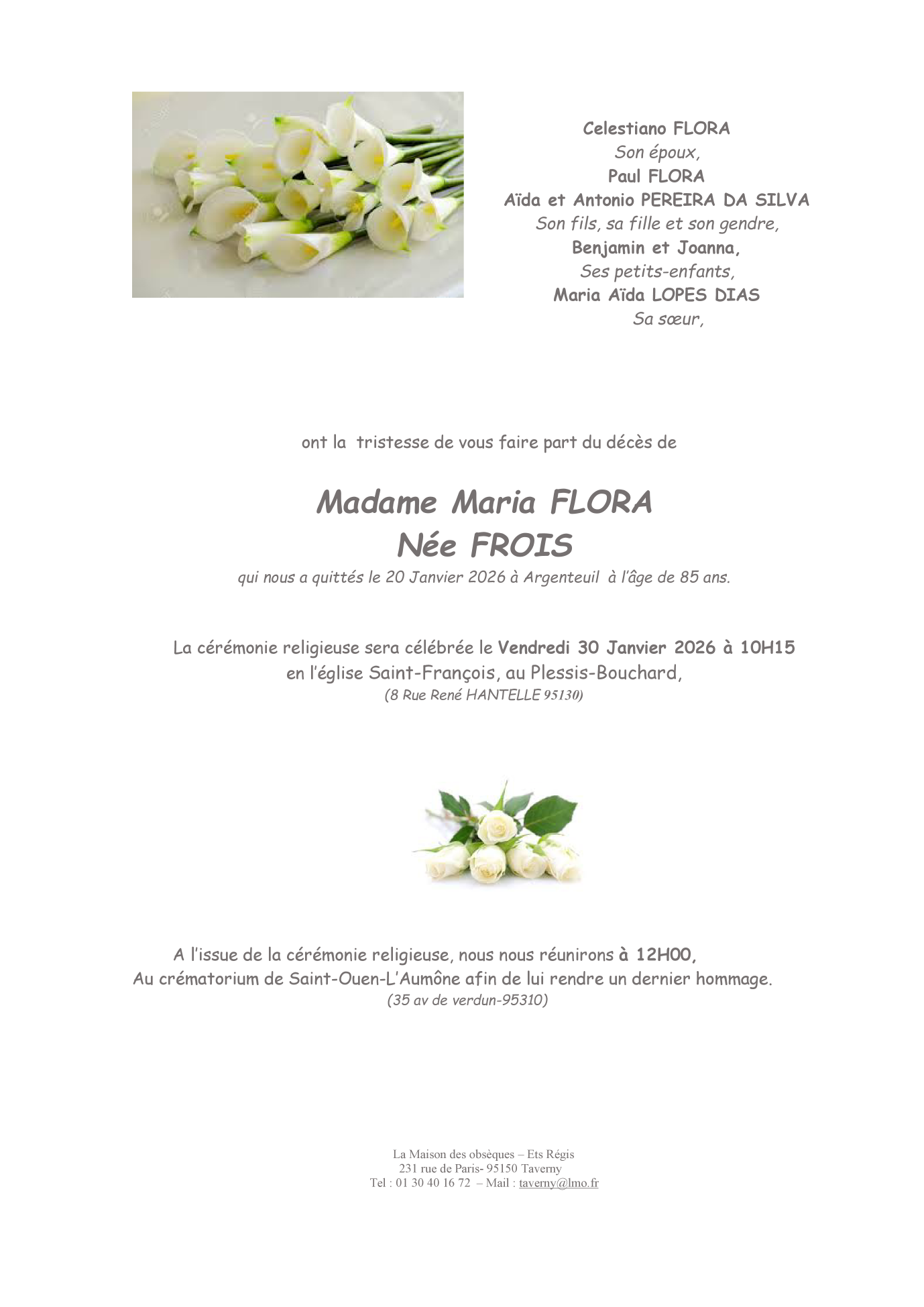 Cet espace « condoléances » est dédié à la mémoire de Madame Maria FLORA née FROIS.