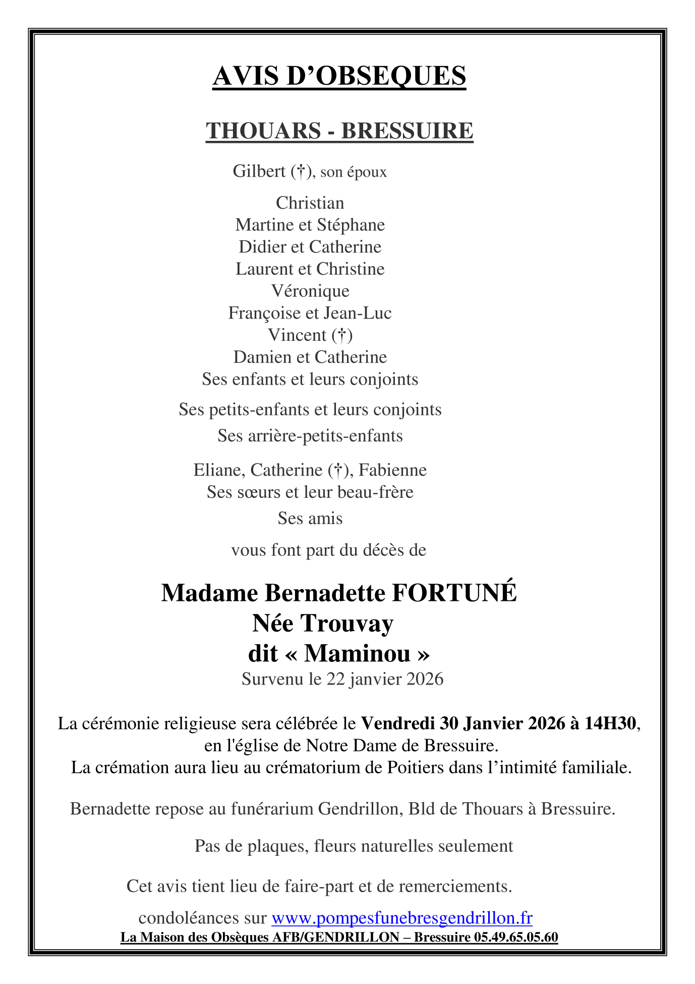 de Madame Bernadette FORTUNÉ née TROUVAY