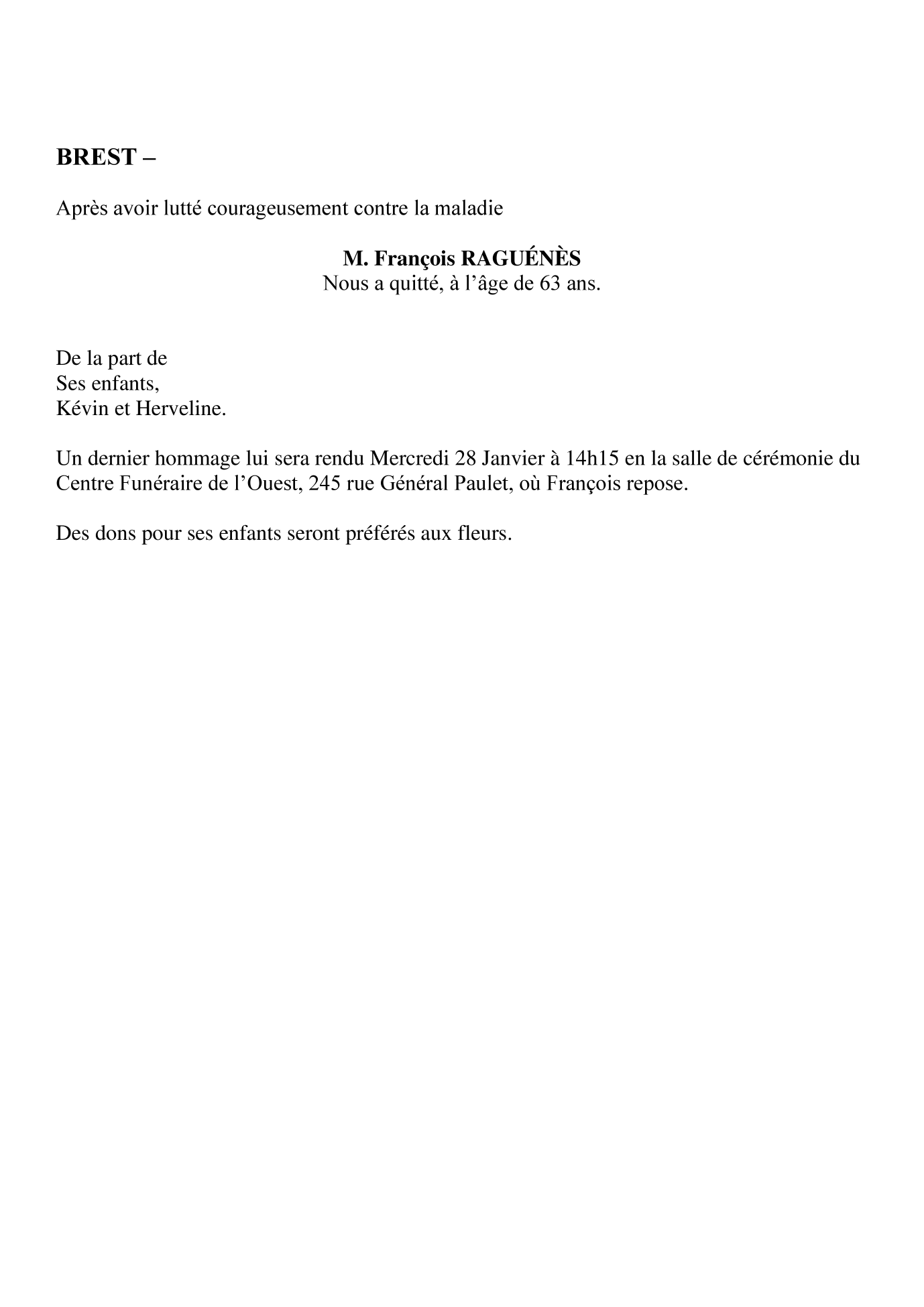 Cet espace « condoléances » est dédié à la mémoire de Monsieur François RAGUÉNÈS.