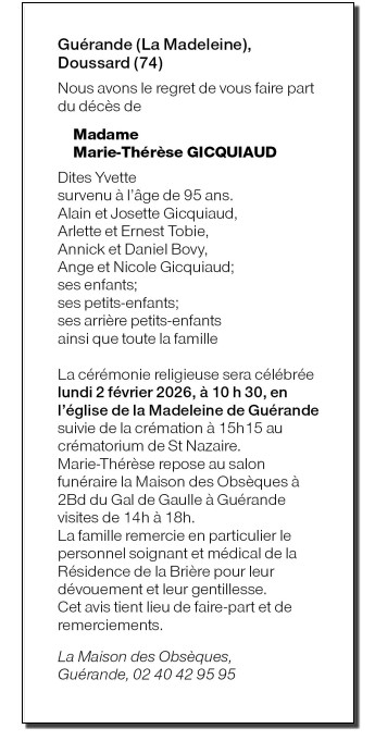 Cet espace « condoléances » est dédié à la mémoire de Madame Marie GICQUIAUD née AVENARD.