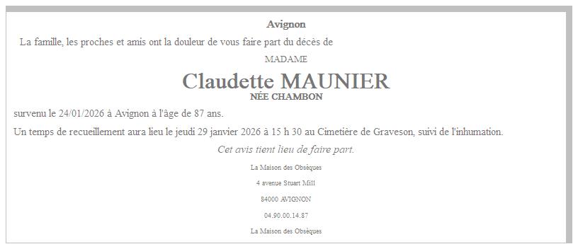 de Madame Claudette MAUNIER née CHAMBON