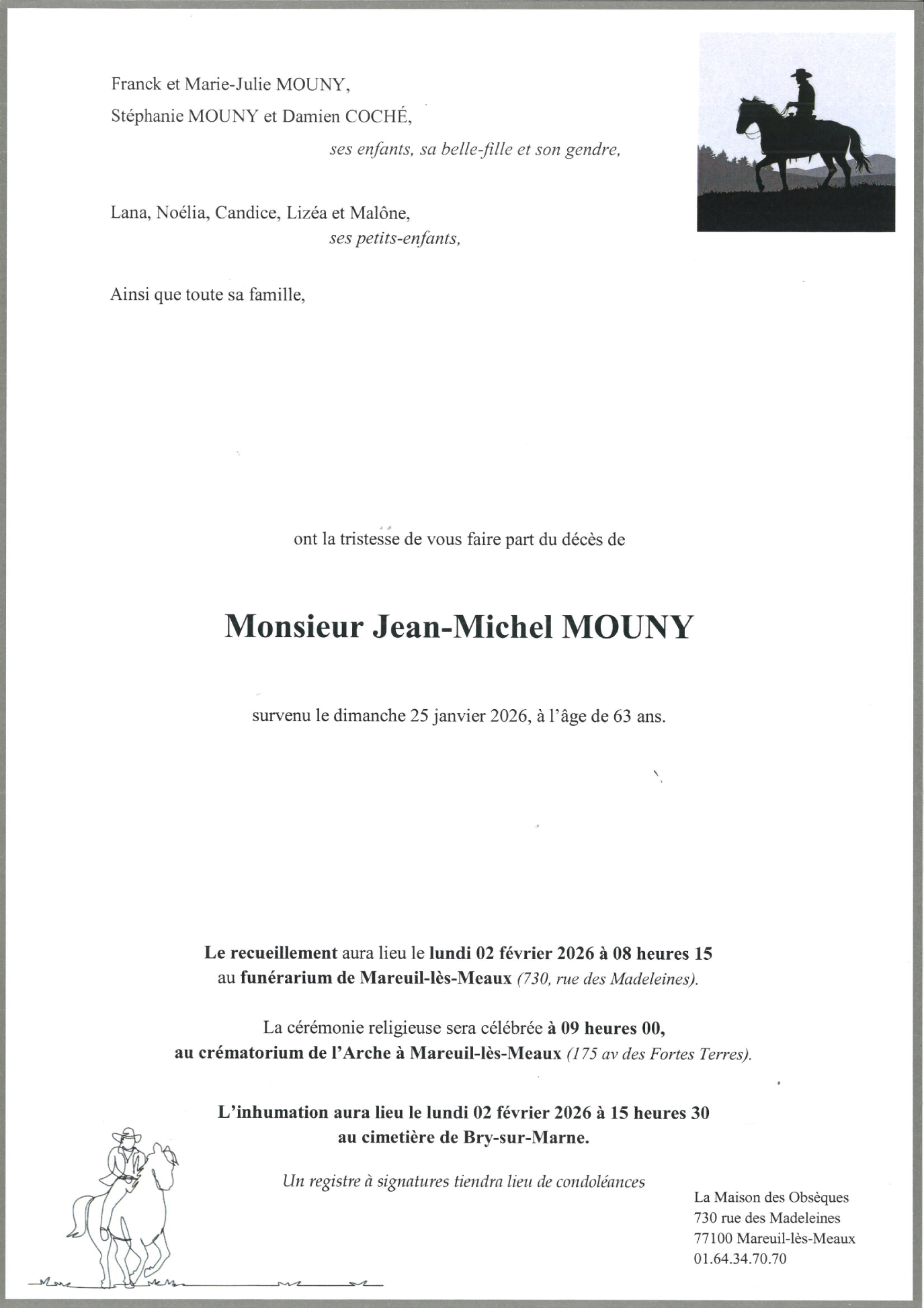 Cet espace « condoléances » est dédié à la mémoire de Monsieur Jean-Michel MOUNY.
