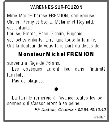 Cet espace « condoléances » est dédié à la mémoire de Monsieur Michel FREMION.