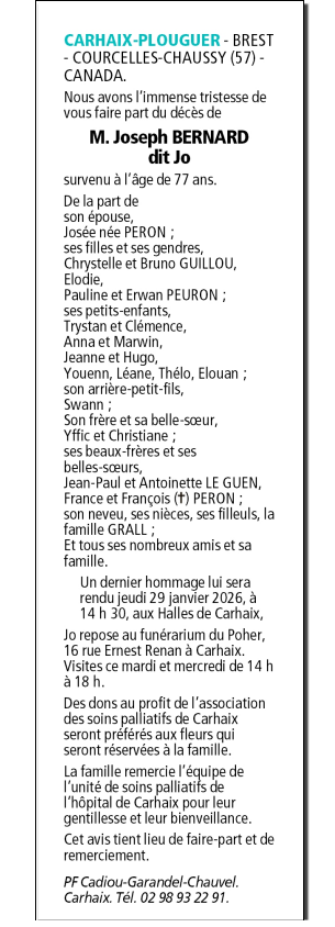 Décédé à Carhaix-Plouguer (29270) le lundi 26 janvier 2026