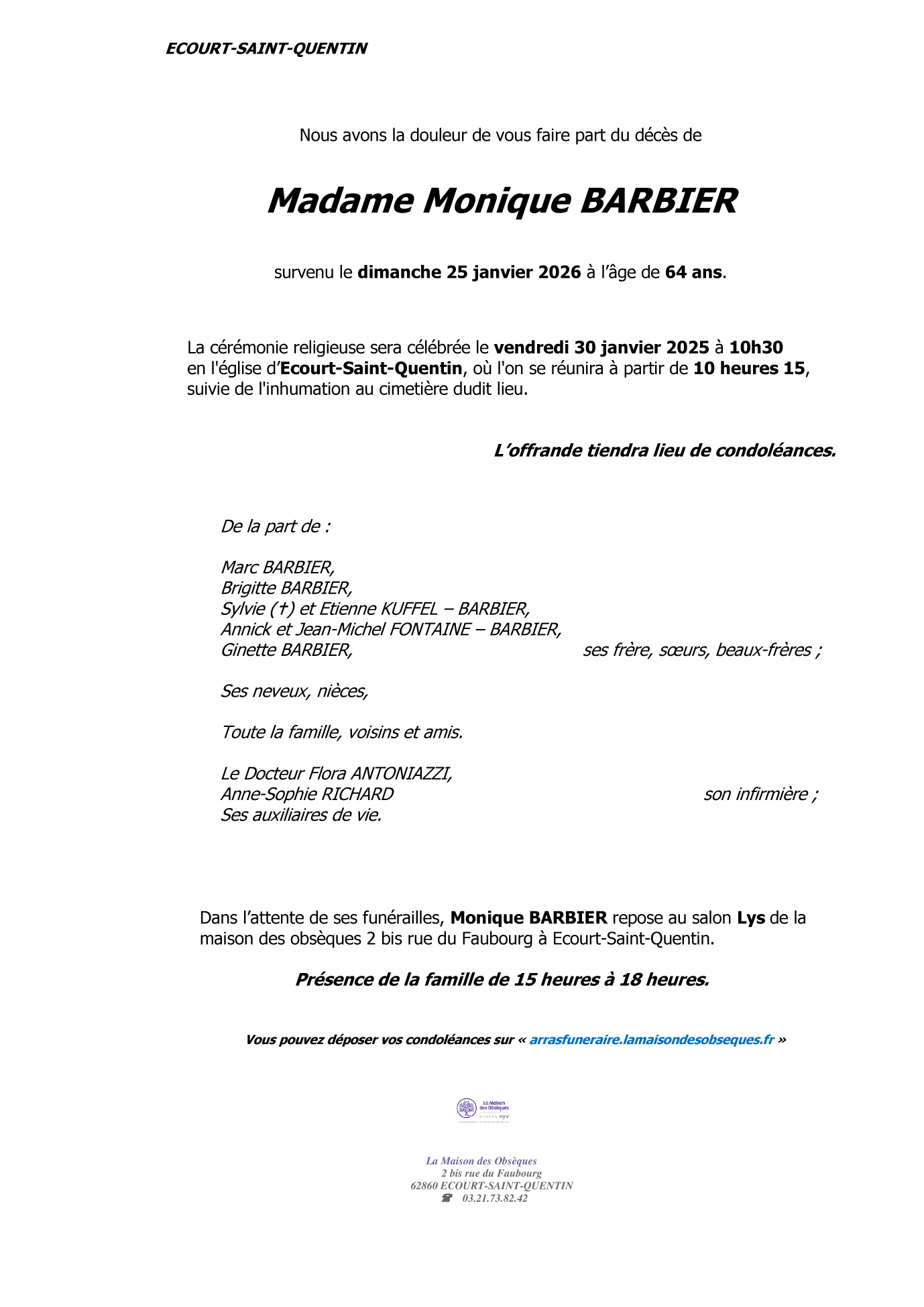Cet espace « condoléances » est dédié à la mémoire de Madame Monique BARBIER.