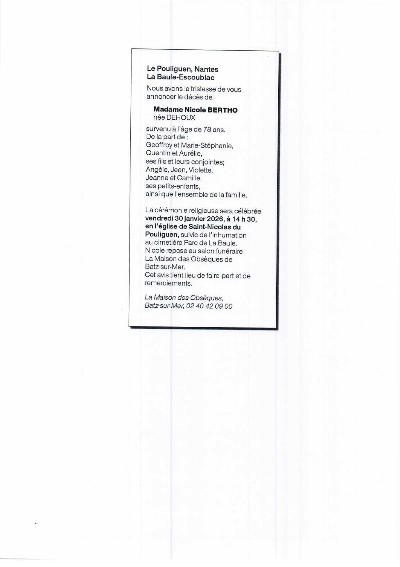 Cet espace « condoléances » est dédié à la mémoire de Madame Nicole BERTHO née DEHOUX.