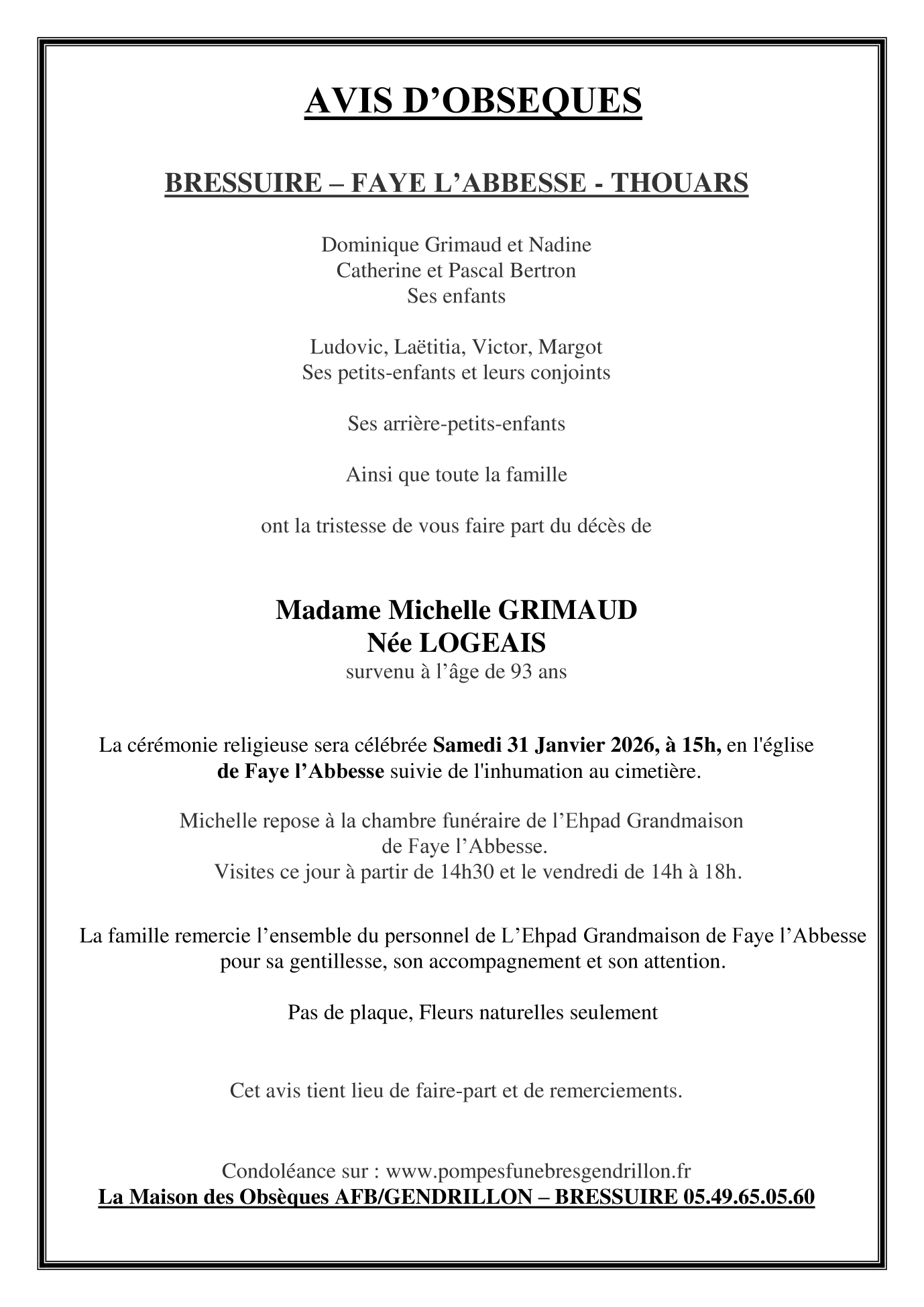 Cet espace « condoléances » est dédié à la mémoire de Madame Michelle GRIMAUD née LOGEAIS.