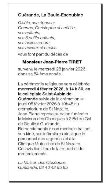 Cet espace « condoléances » est dédié à la mémoire de Monsieur Jean-Pierre TIRET.