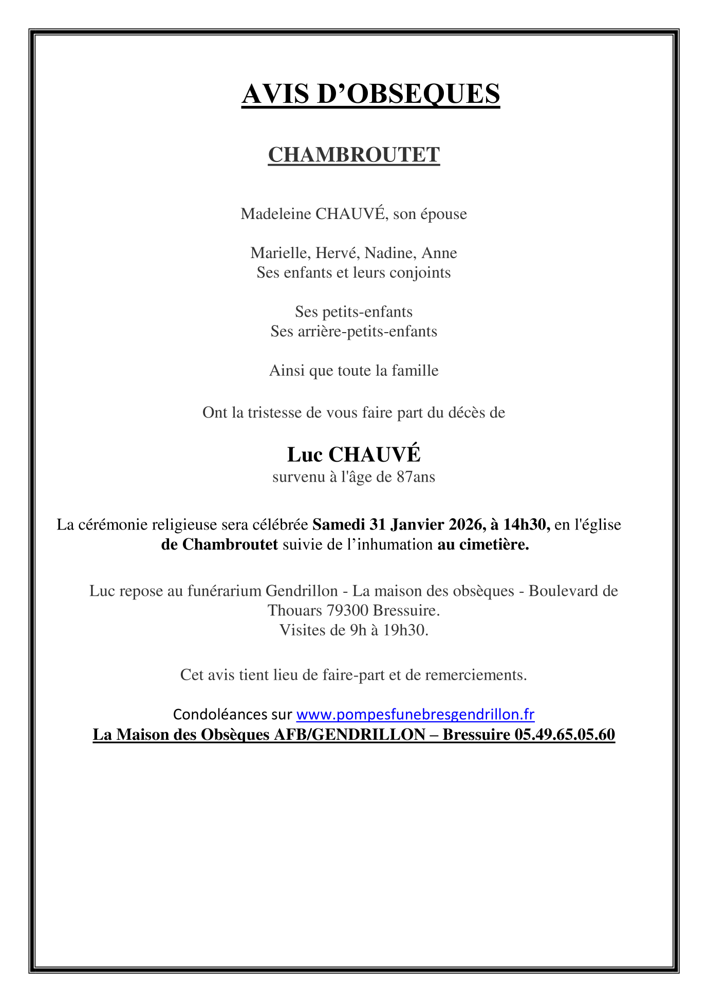 Cet espace « condoléances » est dédié à la mémoire de Monsieur LUC CHAUVÉ.