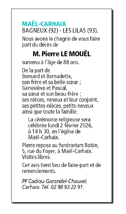 Décédé à Maël-Carhaix (22340) le mardi 27 janvier 2026