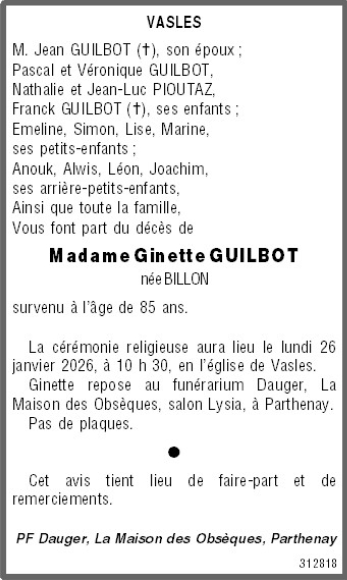 Cet espace « condoléances » est dédié à la mémoire de Madame Ginette GUILBOT née BILLON.
