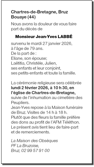 Cet espace « condoléances » est dédié à la mémoire de Monsieur Jean-Yves LABBÉ.