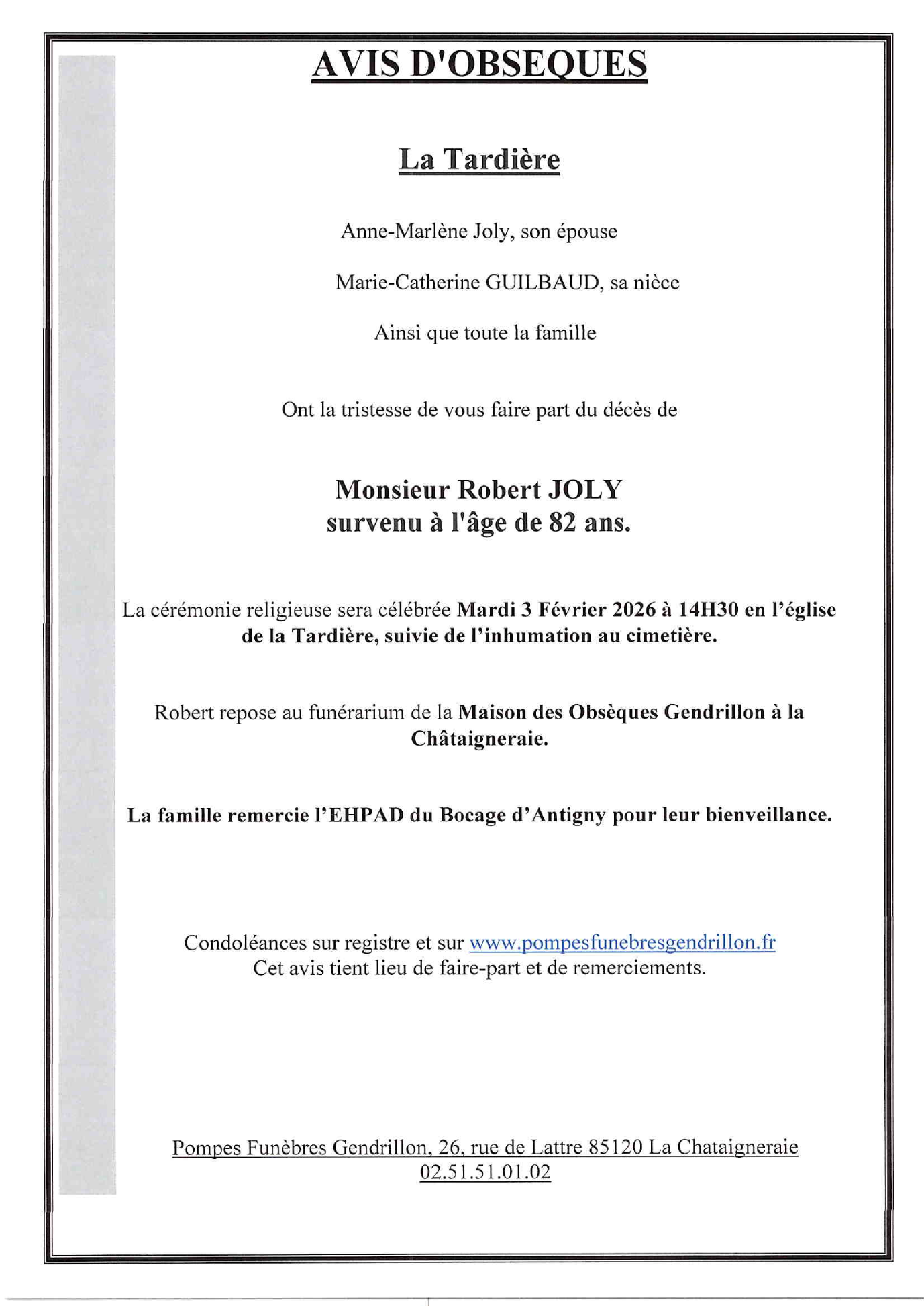 Cet espace « condoléances » est dédié à la mémoire de Monsieur Robert JOLY.