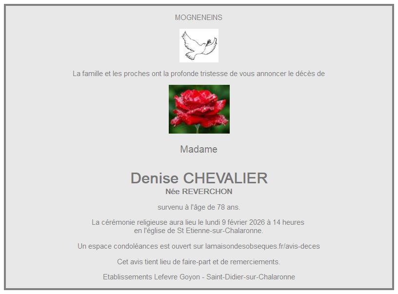 Cet espace « condoléances » est dédié à la mémoire de Madame Denise CHEVALIER née REVERCHON.