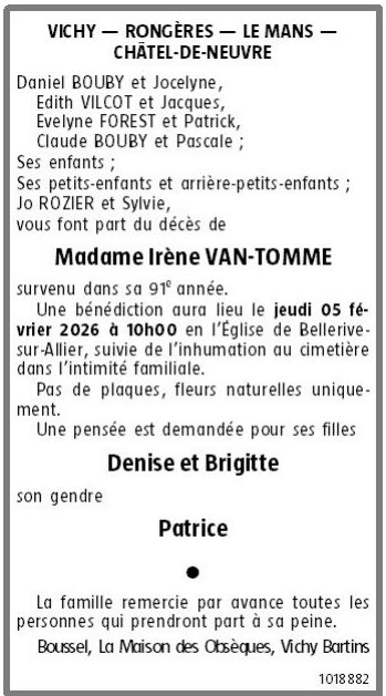 Cet espace « condoléances » est dédié à la mémoire de Madame Irène VAN-TOMME.
