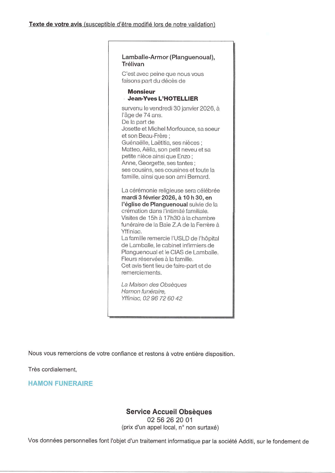 Cet espace « condoléances » est dédié à la mémoire de Monsieur Jean-Yves L'HOTELLIER.