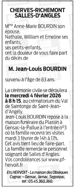 Décédé à Salles-d'Angles (16130) le vendredi 30 janvier 2026