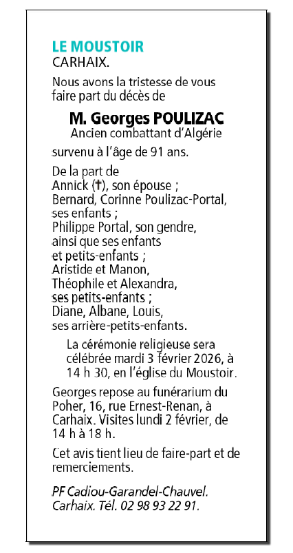 Cet espace « condoléances » est dédié à la mémoire de Monsieur Georges POULIZAC.