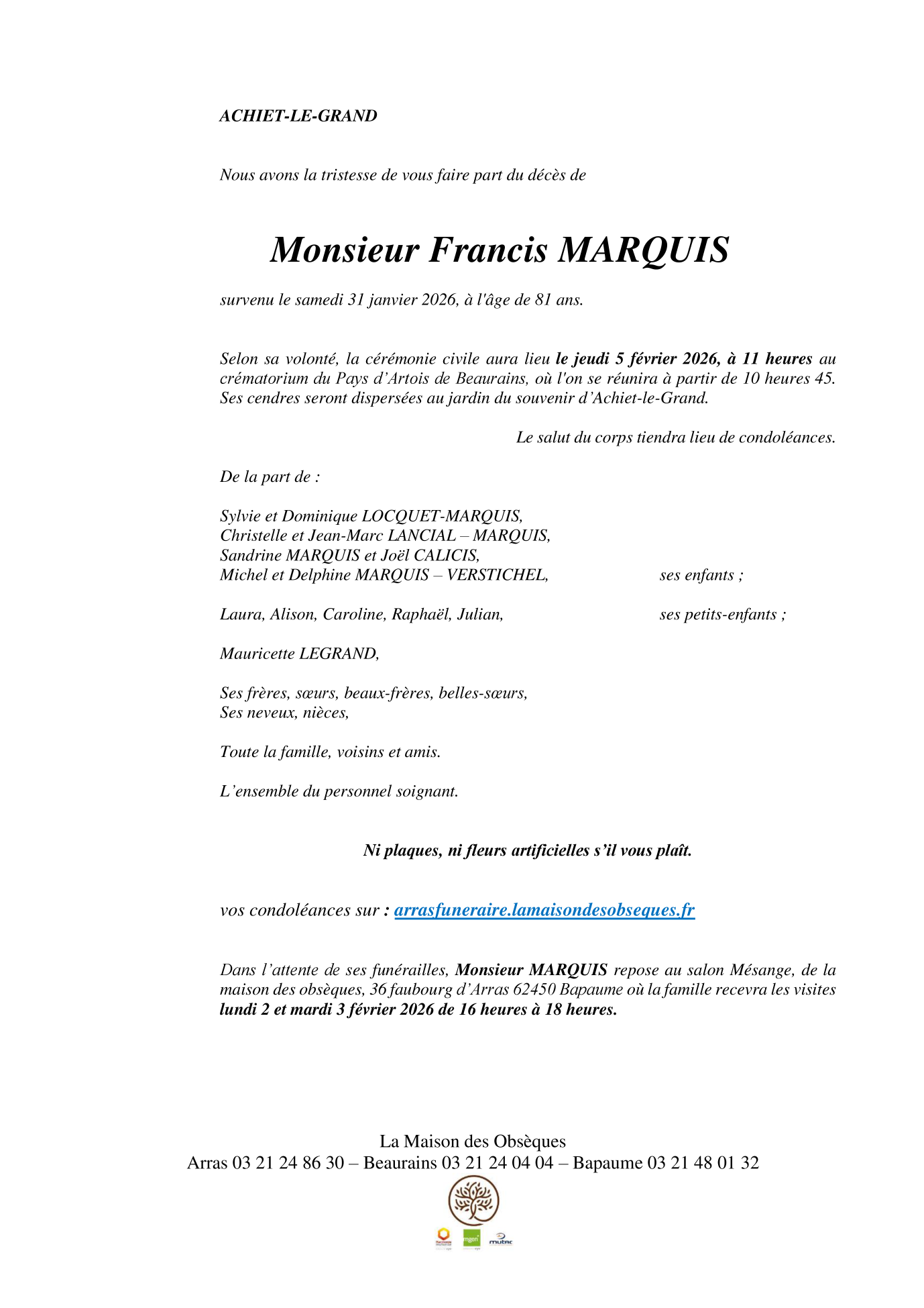 Cet espace « condoléances » est dédié à la mémoire de Monsieur Francis MARQUIS.