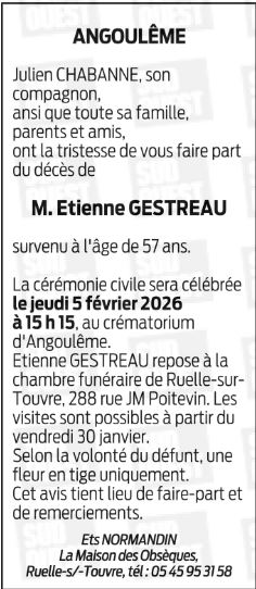 Cet espace « condoléances » est dédié à la mémoire de Monsieur ETIENNE GESTREAU.