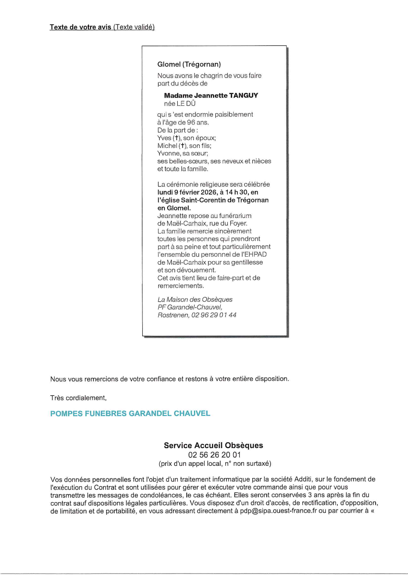 Cet espace « condoléances » est dédié à la mémoire de Madame Jeannette TANGUY née LE DÛ.