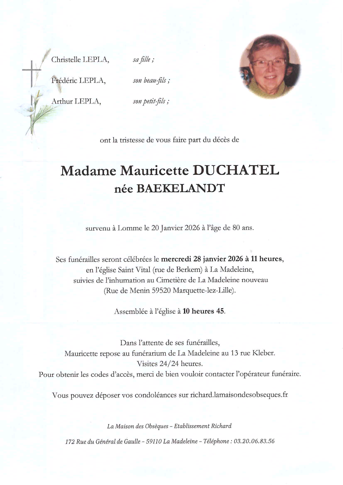 de Madame Mauricette DUCHATEL née BAEKELANDT