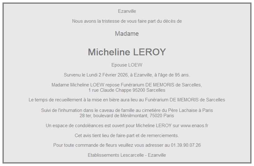 Cet espace « condoléances » est dédié à la mémoire de Madame Micheline LOEW née LEROY.